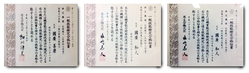 お客様に少しでも安心してもらえたらという思いで、2011年国家資格である「石工施工技能士1級」免許を取得いたしました。